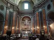 The main altarpiece contains a painting entitled The Birth of Mary, painted by Gaetano Gigante. The chapels to the right have paintings of St Joseph by Francesco Solimena, an anonymous Madonna della Provvidenza, and a Deposition by Domenico Antonio Vaccaro. The chapels on the left have a Sant'Antonio Zaccaria, by Luigi Scorrano; the tomb of the Barnabite priest, St. Francis Xavier Bianchi, and a painting depicting the apparition of the Virgin to peasants in Caravaggio. Other works in the church were completed by Errico Giovine and Giuseppe Bonolis.[1]