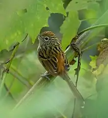 The Santa Marta antbird (Drymophila hellmayri) is a species of bird in the family Thamnophilidae. It is endemic to humid foothill forests of the Sierra Nevada de Santa Marta in Colombia, especially in association with bamboo. This 15 cm (6 in) bird is found at higher elevations. It was previously considered conspecific with the long-tailed antbird.