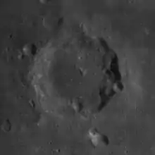 Santbech is a lunar impact crater that is located to the southeast of Mare Nectaris. It lies south-southwest of the prominent crater Colombo. About one crater diameter to the east-northeast is the smaller Monge. The terrain around the crater, although rugged in places, has been flooded by lava and so has a low albedo and a relatively flat surface. It was named after the 16th-century Dutch mathematician and astronomer Daniel Santbech Noviomagus.[1] It is from the Pre-Imbrian period, 4.55 to 3.85 billion years ago.[2]