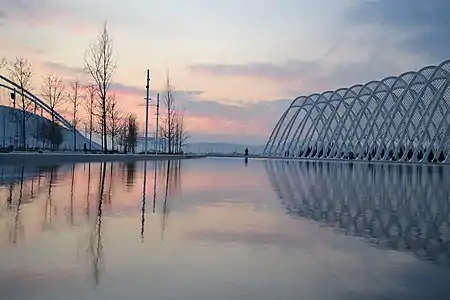 The museum also includes a number of ecological features; water from the sea is used to regulate the temperature inside the building, and to refill the surrounding reflecting pools.[23][24] The Guardian described it as "an other-worldly edifice that looks like a cross between a solar-powered dinosaur and a giant air conditioning unit", and declared "it must already rank as one of the world's most extraordinary buildings."[25]