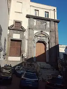 In 1625 Cosimo Fanzago added the stairs at the entrance of the church, and sculpted some of the marble telamons. The atrium was frescoed by Giovanni Bernardino Azzolino. He helped complete the dome which crumbled during an earthquake in 1897 and was not rebuilt. The church now serves as a pharmacy.[2] The paintings by Giuseppe Ribera for the church (Saint Jerome and the Angel of Judgement and The Earthly Trinity with Saints) were moved to the Capodimonte Museum. 40°50′44″N 14°14′42″E / 40.845523°N 14.245091°E / 40.845523; 14.245091