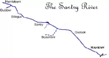 The Santry River rises at an elevation of c. 80m, in the semi-rural areas of Harristown and Dubber in the part of County Dublin now part of the local government area of Fingal, near the village of St. Margaret's and Dublin Airport. The lead branch can be found at the end of a small lane in the former Harristown Demesne, now cut off by new road development. The river then flows along to the south of Dublin Airport (from which some tributary streams enter it), near the new Dublin Bus Harristown depot. With the Dubber branch, it passes for most of its upper course out in the open, flowing through Sillogue Public Golf Course and the northern fringe of Ballymun; up to this point, the main channel is sometimes called Quinn's River.[1]