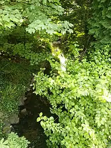 The river traverses Santry, where it forms a major feature of the former Santry Demesne, including the pond within what is now a public park adjacent to multiple housing and commercial developments. It then passes in turn under the old airport road and the M1 motorway. In Coolock, the river forms a central feature in the valley which cuts through the district, and features a pond, sometimes Coolock Lake, and a small cascade, running past the Stardust Memorial Park, and through the grounds of Cadbury's Ireland, where there is an EPA monitoring station and a tumulus on its banks, just before it passes under the Malahide Road.[1]