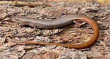 Saproscincus mustelinus,[3] commonly known as the southern weasel skink or weasel shadeskink, is a small species of skink which is endemic to Australia.
