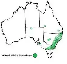The southern weasel skink's distribution forms a coastal strip from south Victoria to southern Queensland.[4][9]