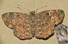 The wingspan is 36–38 mm for males and 38–40 mm for females. Adults are on wing year-round, although they are scarcer in winter and the dry season.[2]