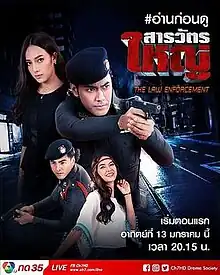 Sarawat Yai (translates roughly as "Big Inspector") or internationally titled The Law Enforcement is one of the few television miniseries that gives a true reflection of the modern Thai society with an emphasis on The Royal Thai Police Force. The title is actually a play on words with double meaning, namely 'the big Inspector' and 'the Inspector named Yai'. This 15-episode 2019 version of Sarawat Yai airs on Channel 7 HD every Friday during the 8:05pm, Saturday and Sunday during the 8:15pm time slot, with the first episode premiering on Sunday January 13, 2019.