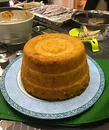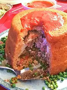 Rice, a product imported by the Aragonese in the Kingdom of Naples,[2] did not find success in South Italy - except in Sicily, where it was introduced by the Arabs. It was adopted by the Salerno School of Medicine and prescribed as a cure for the sick, but not by the people, who preferred pasta. The sartù was probably born from the need to adapt this dish to the taste of the court, under the influence of the Austrian queen Maria Carolina of Austria. The monsù, French court cooks, created this dish in the eighteenth century, enriching the rice with numerous ingredients[3] and masking the flavor with tomato sauce.[4] The very name of the dish would come from the French surtout, the centerpiece that was used in the eighteenth century and that could also be used to bring the sartù to the table, cooked like a timballo.[2]