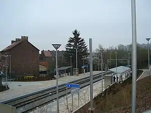 The original Sart-Culpart station structure was built in the 1980s as an underground station slightly to the east of the current location, but has never been put into service since then.[1] The unfinished station has been vandalized through the years and it was rebuilt in a more urbanized and secure location as part of the 2009-2011 extension of the Gilly branch of the network.[2]