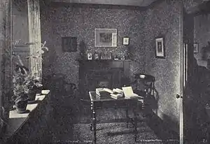 Carlyle worked on an earlier novel, Wotton Reinfred, which MacMechan refers to as "[t]he first draft of Sartor."[4] Carlyle finished seven chapters of the semi-autobiographical novel depicting a young man of deeply religious upbringing being scorned in love, and thereafter wandering. He eventually finds at least philosophical consolation in a mysterious stranger named Maurice Herbert, who invites Wotton into his home and frequently discusses speculative philosophy with him. At this point, the novel abruptly shifts to highly philosophical dialogue revolving mostly around Kant.[5] Though the unfinished novel deeply impressed Carlyle's wife Jane,[6] (née Welsh) Carlyle never published it and its existence was forgotten until long after Carlyle's death. MacMechan suggests that the novel provoked Carlyle's frustration and scorn due to the "zeal for truth and his hatred for fiction" he speaks of in his letters of the time.[7] Numerous parts of Wotton appear in the biographical section of Sartor Resartus, where Carlyle humorously turns them into Teufelsdröckh's autobiographical sketches, which the editor constantly complains are overly fragmented or derivative of Goethe. Though widely and erroneously reported as having been burned by Carlyle, the unfinished novel is still extant in draft form; several passages were moved verbatim to Sartor Resartus, but with their context radically changed.[6]