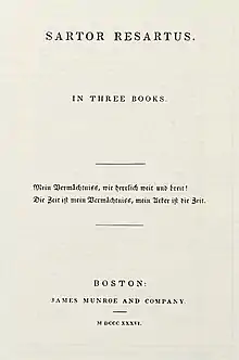 Carlyle had difficulty finding a publisher for the novel, and he began composing it as an article in October 1831 at Craigenputtock.[8] Fraser's Magazine serialised it in 1833–1834. The text would first appear in volume form in Boston in 1836, its publication arranged by Ralph Waldo Emerson, who much admired the book and Carlyle. Emerson's savvy dealing with the overseas publishers would ensure Carlyle received high compensation, which the novel did not attain in Britain.[9] The first British edition would be published in London in 1838.[10]