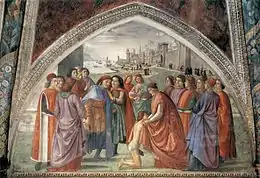 This scene portrays a posthumous miracle by St. Francis, connected to the Sassetti family and for this reason located in a central position of the chapel, although out of chronological order with the death of St Francis. It portrays the resurrection of a boy who had died falling from Palazzo Spini Feroni, a palace on the piazza facing Santa Trinita. According to some authorities, Ghirlandaio was inspired by Masaccio's The Tribute Money in the Brancacci Chapel.