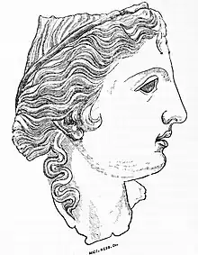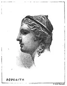 As early as 1873 Charles Thomas Newton identified the head with Venus.[40] It has been generally assigned to Aphrodite.[lower-alpha 2] However, this has not been universally accepted,[15] with Otto Benndorf suggesting commonalities with male deities, such as Apollo or Dionysos.[35][41] Babken Arakelyan found Artemis to be a more probable subject than Aphrodite.[42]