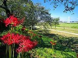 - Gongendo Tsutsumi (Japanese: 権現堂堤). About 1,000 Yoshino cherry trees are spread out over 1 km along the top of the levee of the Gongendo river. During cherry blossom season, many visitors from all over the prefecture and beyond come to enjoy the picturesque pink and yellow of cherry and rapeseed blossoms, and vendors set up stalls. The levee is also sown with hydrangea and red spider lilies, which bloom in the summer and fall.