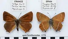 Satyrium spini has frontwings reaching 14–16 millimetres (0.55–0.63 in) in males, 15–17 millimetres (0.59–0.67 in) in females. The basic color of the upperside of the wings is brownish, while the underside is yellowish-beige. In the females the upperside of the hindwings usually shows brownish-orange spots on the edge. The underside of the hindwings has a large blue spot and a few orange black bordered spots. The underside of forewings and hindwinhs is crossed by a bright white transverse line. Hind wings have short tails.[3][4][5]