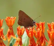 The coral hairstreak is frequently seen visiting butterfly weed, but also uses New Jersey tea, dogbane and sulphur flower as nectar plants.