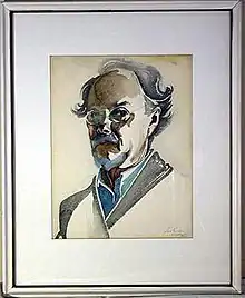 Raskin was probably known more as a painter and caricaturist within the American Jewish community than as a critic.[8] He worked in various media and was known for his realist approach and attention to detail.[4] His work focused on scenes of Jewish life and tradition particularly in the Lower East Side of New York.[4] His first exhibition was in 1922.[5] Raskin's paintings, sketches and lithographs portraying Jewish life in the Yishuv in Palestine were well known in the U. S. having appeared in many exhibitions and the press.[18] They were widely praised by art critics.[18] The lobby of a theater at the corner of Second Avenue and Eleventh Street, at the northern end of the "Yiddish Broadway" in the Yiddish Theater District in the Lower East Side was decorated with his paintings of Palestine.[19] He made a number of trips to Palestine, at least four between 1921 and 1937,[1] five by 1947[20] and later to Israel. He stayed at the kibbutz Ramat Yochanan while in the British mandate for Palestine.[21] In 1947 Raskin published Land of Palestine which contained "more than 300 drawings and paintings made during the artist's five visits to Palestine, together with short essays on Palestinian life."[20] He produced poster art to support the Zionist movement. His poster Stand Up and Be Counted from the 1930s shows a central figure of a tall and determined American Jew holding up a Shekel surrounded on one side by images of destruction and on the other by images of a brighter future in a Jewish homeland promised by contributing to the Zionist organization.[22][23][24]