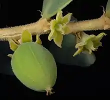 Sauropus species have alternate, entire leaves with short petioles and small stipules. Flowers appear at axils and mainly form clusters. There are 6 perianth segments divided in 2 whorls, with female flowers often having bigger perianths. At male flowers, the perianth is tube-like, with 3 stamen. The fruit is berry-like, ovoid or globose, and fleshy.