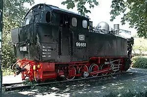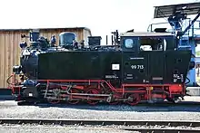 The locomotives 99 713 and 715 were also preserved, initially in Radebeul-Ost. 99 713 was kept operational by the DR as a traditionslokomotive, 99 715 served as a spare parts donor and was officially a monument locomotive in front of the museum train in Radebeul Ost. In 1992, 99 713 was given the new fleet number 099 720 on paper, but it was rarely used. 99 715 was sold in 1991 to the later GbR 99 715 Wilsdruff and finally refurbished until 2003. She has been employed by the Preßnitztalbahn since 2004 and can be seen in operation.[3] The 99 713 wenth to the Sächsische Dampfeisenbahngesellschaft (SDG) in 2004. It was transferred to Oberwiesenthal in October 2015 after a long period of storage, received a general inspection there and has been operational again since July 2017.[4]