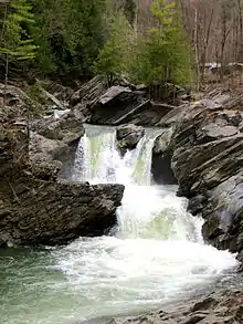 There are three notable waterfalls on the Saxtons River, listed from upriver to downriver: Saxtons River Falls in the village of Saxtons River, just below Centennial Bridge on Westminster St; Gages Falls in North Westminster, also called Gageville, just below the bridge on Covered Bridge Rd; and Twin Falls, a short distance downriver from Gages falls in North Westminster near Forest Rd.[5][6]