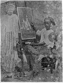 At least two of Saya Aye's court scenes of the Burmese monarchy (on zinc plates, dated 1918) have survived in good shape and both of them are startling.[4] While Aye's teacher, Saya Chone, had begun to master Western techniques, except in the case of photographs of three or four portrait paintings,[2][6] whose whereabouts is unknown, Chone did not exhibit much desire to depict human features realistically. In general, the portrait figures in Chone's paintings lack individuation, one face looking much like another,[4][5] in much the same way that ukiyo-e painting in Japan does, without capturing a sense of a subject's true looks or personality. In Aye's two zinc court portraits, a great deal more personality is expressed, with a great brooding darkness and shadowing.[4] In these works, he also exhibits mastery of sfumato.