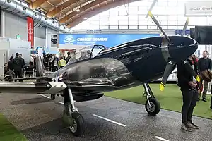 The design's structure is made from carbon fibre. Its 7.900 m (25.9 ft) span wing mounts flaps. The Mustang features electro-hydraulic retractable landing gear, hydraulic disc brakes on the main wheels, dual controls and electrically-operated flaps. It also has three-axis fly-by-wire trim tabs, electrically-adjustable rudder pedals, two internally-mounted 58 litres (13 imp gal; 15 US gal) Kevlar/carbon fibre fuel tanks and detachable outer wing panels. The design includes two baggage compartments, one in front of the firewall and one behind the cockpit. The manufacturer has made the aircraft as similar to the original as possible, down to the simulated metal finish, rivets and other details. It also includes a 2000 watt sound system that provides a Rolls-Royce Merlin engine sound and a smoke generator for start-up smoke simulation.[1][2][3][4][5]