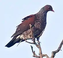 The scaled pigeon was formally described in 1789 by the German naturalist Johann Friedrich Gmelin in his revised and expanded edition of Carl Linnaeus's Systema Naturae. He placed it with all the other doves and pigeons in the genus Columba and coined the binomial name Columba speciosa.[2] Gmelin based his description on "Le Ramiret" and the "Pigeon ramier de Cayenne" that had been described and illustrated in 1871 by the French polymath Georges-Louis Leclerc, Comte de Buffon.[3][4] The scaled pigeon was moved to the resurrected genus Patagioenas based on a molecular phylogenetic study published in 2001.[5][6][7] The genus had been introduced by the German naturalist Ludwig Reichenbach in 1853.[8] The genus name combines the Ancient Greek patageō meaning "to clatter" and oinas meaning "pigeon". The specific epithet speciosa is from Latin speciosus meaning "beautiful".[9] The species in monotypic: no subspecies are recognised.[7]
