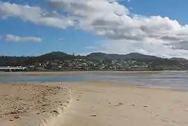 The wide river mouth has been a challenge to bridge builders for many years. Richard Terry constructed a timber bridge in 1865, but it collapsed around May in 1875 while a large herd of cattle was being driven across it.[2] A second and third bridge were successively washed away in floods in 1889 and 1911. Further bridges succumbed to flood and shipworms, the last timber bridge collapsing in 1929. A truss bridge was built in 1936 and still stands today, used by pedestrians and bicycles. The concrete bridge that currently carries the Tasman Highway was built on a better alignment nearby and officially opened on 26 June 1991.
