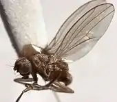 Scaptomyza flava is an herbivorous leaf mining fly species in the family Drosophilidae. In Latin, flava means golden or yellow.[1] The fly is amber to dark brown in color and approximately 2.5 mm in length.[2][3] In Europe and New Zealand[4][5][6] the larvae are pests of plants in the order Brassicales, including arugula, brassicas, broccoli, Brussels sprouts, bok choy, cabbage, canola, cauliflower, horseradish, kale, kohlrabi, napa cabbage, nasturtium, radish, rapini, rutabaga, turnip, wasabi and watercress.[4] In New Zealand, its range has expanded to include host species that are intercropped with salad brassicas, including gypsophila, otherwise known as baby's breath, which is in the pink family (Caryophyllaceae) and the pea (Pisum sativum) in the Fabaceae.[6] More typically, S. flava is oligophagous within the Brassicales. Scaptomyza are unusual within the Drospophilidae because the group includes species that are truly herbivorous.[7][8][6] Other herbivorous drosophilids include D. suzukii, which attacks fruit very early during ripening[9] (and so is a frugivore) and species within the genus Lordiphosa, from Africa and Asia, which also include leaf miners.[10] Most drosophilids feed on microbes associated with decaying vegetation and sap fluxes.[11]