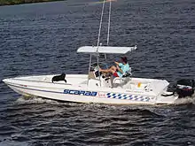 Scarab boats were popularly featured in the 1980s TV series Miami Vice. As of the second season of the series, the main character Sonny Crockett piloted a Wellcraft 38 Scarab KV.[3] In Riptide, the counterpart to the eponymous boat where the detectives work is the Ebb Tide, a 38' Scarab powered by KAAMA Power Systems.[4] Scarab also was a main feature of the TV show Baywatch from season 2 onwards. One was used by television presenter Richard Hammond in a special episode of The Grand Tour entitled "The grand tour presents... Seamen".[5] The boat livery originally said "Razzle Dazzle" but this was changed by co-presenters Jeremy Clarkson and James May to say "Jizzle Drizzle".