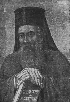 Vârnav belonged to a large family of the Moldavian boyar nobility, attested back to 1621; he was distantly related to Teodor Vârnav, the Bessarabian writer.[8] His immediate ancestors had taken up liberal causes, inspired by the Carbonari.[9] One relative, Petrachi, also led the Moldavian resistance to the "Sacred Band" during the civil war of 1821, alongside Gavril Istrati.[10] Scarlat was generally believed to have been the son of Ban Vasile Vârnav (died 1824), noted as a book collector and translator to Romanian—in particular for his renditions of Dimitrie Cantemir's Descriptio Moldaviae,[11] Condillac's Logique,[12] Dionisie Fotino's Istoria tis palai Dakias,[13] and Cesare Beccaria's On Crimes and Punishments.[14] As argued by Zahariuc, this identification is partly misleading: Scarlat's father was indeed a Vasile Vârnav, but not the same as the translator; his wife, and Scarlat's mother, was Maria née Gheuca.[15] The future monk's distant cousins included Sofronie Miclescu, who would later serve as Metropolitan Bishop of Moldavia.[16]