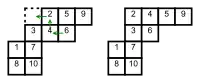 Given a skew standard Young tableau T of skew shape , pick an adjacent empty cell c that can be added to the skew diagram ; what this means is that c must share at least one edge with some cell in T, and must also be a skew diagram. There are two kinds of slide, depending on whether c lies to the upper left of T or to the lower right. Suppose to begin with that c lies to the upper left. Slide the number from its neighbouring cell into c; if c has neighbours both to its right and below, then pick the smallest of these two numbers, favoring the one below. (This rule is designed so that the tableau property of having increasing rows and columns will be preserved.) If the cell that just has been emptied has no neighbour to its right or below, then the slide is completed. Otherwise, slide a number into that cell according to the same rule as before, and continue in this way until the slide is completed. After this transformation, the resulting tableau (with the now-empty cell removed) is still a skew (or possibly straight) standard Young tableau.