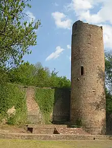 Of the former castle, all that has survived is the castle gate in the southeast, part of the shield wall (once joined to the town walls in a continuous curtain wall), the round bergfried (occupied by bats and therefore no longer climbable), a gable walls of the palas, which had cellars, and a small zwinger (now a terrace with views over the Main and Saale valleys and the Spessart hills).