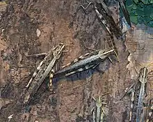 Schistocerca nitens is a species of grasshopper known by several names, including vagrant grasshopper and gray bird grasshopper. It is a close relative of the desert locust, which is in the same genus. This grasshopper is native to southern North America including Mexico and the south-western United States from California to Texas. Vagrants are occasionally found in Colorado and Nebraska, where the climate is too cold for them to reproduce, otherwise. It is also present in parts of Central and South America. It lives in many habitats including desert, woodland, and lower elevation mountainous areas. It is a large grasshopper, reaching lengths of 4 to 7 centimeters. It is mostly brown and gray spotted or patched in cryptic coloration. This species is known as a pest on ornamental plants and many types of crop plants.