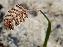 The fern is a mat-shaped plant from which arise slender upright fronds composed of a single unbranched blade. Infertile fronds are 5–12 cm high and 1–2.5 mm wide, while the rarer fertile fronds are 8–20 cm high. Thinner than the infertile fronds, the fertile fronds are topped with a tiny combed reproductive growth.[1] These are 3 to 16 mm long.[3]