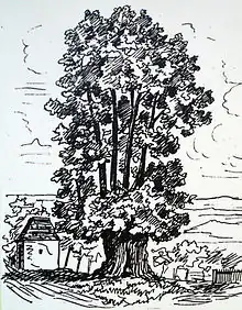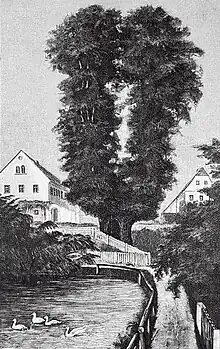 In the magazine there is a picture of the Linden tree, created based on a photograph taken by Th. Kirsten in Dresden.[11] Additionally, the local museum of Maxen has an artistically oil painted picture, based on the same photograph.[4] The picture is supposed to show the lime tree before the storm event of 1884. However, some sources describe the image as depicting the tree’s condition after the 1884 event.[3] A photograph from around 1900 shows that half of the tree’s crown consisted of shorter, young branches.[8] According to the mountain club Über Berg und Tal's logbook, on May 7, 1911, 40 members of the Society for Saxon History hiked from Malter to Ploschwitz via Reinhardtsgrimma and Maxen, via the Schmorsdorf lime tree.[12]