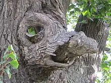 The lime tree stands at approximately 24 meters in height with a crown diameter of around 20 meters.[8] Prior to losing part of its crown in a storm in 1884, it was 44 meters high.[7] The trunk of the tree features two gate-like openings on one side, leading to interconnected cavities that can accommodate up to 15 people.[4] Adventitious stems have emerged in these cavities, providing nutrients to various parts of the crown. The inner walls of the trunk cavity are covered with new bark, a unique characteristic of linden trees.[3] The trunk cavity extends into seven individual trunks. Large branches form a dense, foliage-rich crown at a height of four meters, despite the damage incurred at the end of the 19th century.[3] The strong branches of the crown are connected to each other using a flexible belt system, ensuring the prevention of branch breakage. This dynamic securing allows for natural crown movement while gently restraining excessive motion.