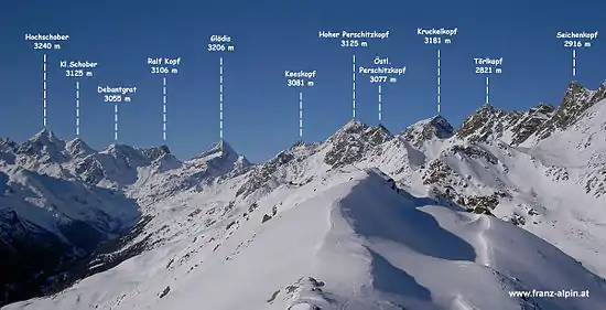 ![]() Northeastern part of the Schober group, view from Grossglockner High Alpine Road with the Alwitzsch, Bretterköpfen, Hoher Seekamp and Karlkamp (from the left) | |