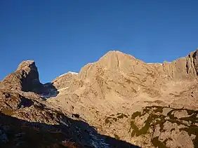 ![]() The Torsäule (left) and Schoberköpfe (centre) with the Teufelskirche in front, seen from the Ochsenriedl | |
