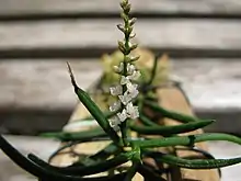 Schoenorchis micrantha, commonly known as the tangled flea orchid,[2] is a small epiphytic orchid that forms small, tangled clumps and has thin stems, many linear leaves and up to thirty small, white, bell-shaped flowers. It is found from Indochina to the south-west Pacific.