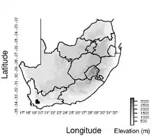 Schoenus aureus grows in mountainous habitats of the Western Cape Provinces of South Africa, in the area near Worcester.[1] This species generally grows within fynbos vegetation on mountain slopes.[1]