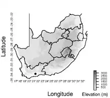 Schoenus triticoides is known to occur near Tierhuiskloof in the Western Cape Province of South Africa, where it has been observed growing along a jeep trail on a lower mountain slope.[1]