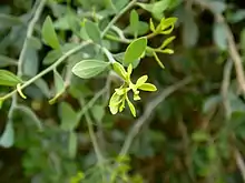 From February to April, small, urn-shaped red flowers appear on the plant. The perianth is reddish-yellow, and is 3 to 8 mm (0.12 to 0.31 in) long. There are 4 to 5 petal lobes. The stamens are equal in number to the lobes of the perianth and placed opposite to them. The flowers transform into a fleshy, ovoid fruit about 6 mm (0.24 in) long that appears similar to a grape when mature. The bony seed below the fleshy fruit is covered in dark longitudinal lines.[1][3]