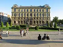 The school building was erected in 1882-1885 according to plans by František Schmoranz Jr. and Jan Machytka inspired directly by the art academies in Paris and Vienna. Originally, the school occupied only the wing on the Alšově nábřeží embankment, while the wing facing Jan Palach Square (Czech: Náměstí Jana Palacha) housed the Academy of Painting.