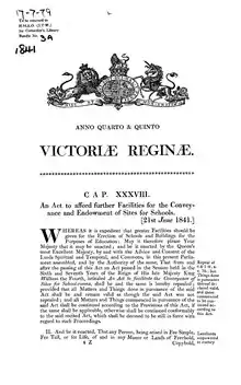 The Schools Sites Act of 1841 (4 & 5 Vict. c. 38) is an Act of the Parliament of the United Kingdom (the long title of which is An Act to afford further Facilities for the Conveyance and Endowment of Sites for Schools)[2] which allowed land-owners to sell or donate a maximum of one acre of land to charities for the provision of schooling 'poor persons'. The act covered England and Wales and Scotland was also covered until the Education (Scotland) Act 1942 (although any donated land in Scotland under the act prior to this was not affected by the latter act).