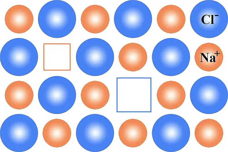 Schottky defects consist of unoccupied anion and cation sites in a stoichiometric ratio. For a simple ionic crystal of type A−B+, a Schottky defect consists of a single anion vacancy (A) and a single cation vacancy (B), or v•