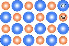 This can be illustrated schematically with a two-dimensional diagram of a sodium chloride crystal lattice:
