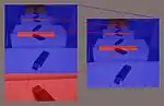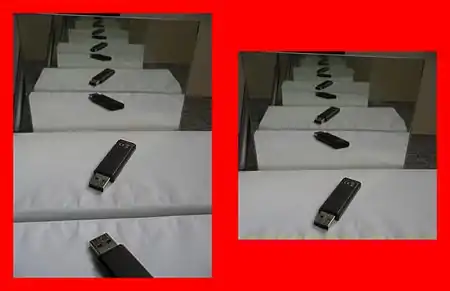 | Mirror-in-mirror images as counterexample: The left image can be embedded into the right one and vice versa (below, left/mid); yet, both aren't similar. The Schröder-Bernstein theorem applied to the unstructured pixel sets obtains a non-continuous bijection (right). | ||