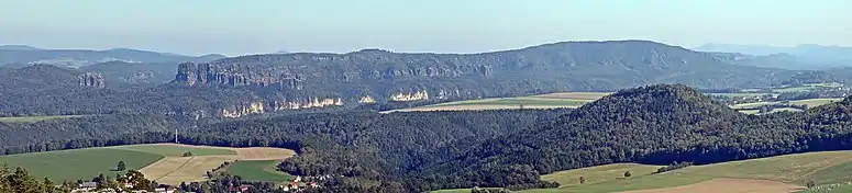 The Schrammsteine are a long, strung-out, very jagged group of rocks in the Elbe Sandstone Mountains located east of Bad Schandau in Saxon Switzerland in eastern Germany. To the north they are bordered by the Kirnitzsch valley, to the south by the Elbe valley and to the east by the Affensteine rocks. The high point of the chain lies at over 400 m above sea level (HN). The viewing point on the Schrammsteine lies at a height of 417.2 m above HN.[1]