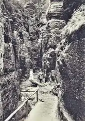 The first touristic development of the gorge occurred comparatively late on. In 1886, at the initiative of the Alpine Club for Saxon-Bohemian Switzerland, a walkway was built through the Schwedenlöcher. To build the steps and bridges the gorge had to be artificially widened in places. The new footpath, which linked the well known rock massif of the Bastei with the Amselgrund, was opened on 1 May 1886 on the occasion of the 6th German Geographers’ Day. In 1967/68, comprehensive renovation was carried out on the path. This involved the construction of 3.5 tons of steel and 600 concrete slabs. The path has 777 steps and over 20 concrete bridges.[1]